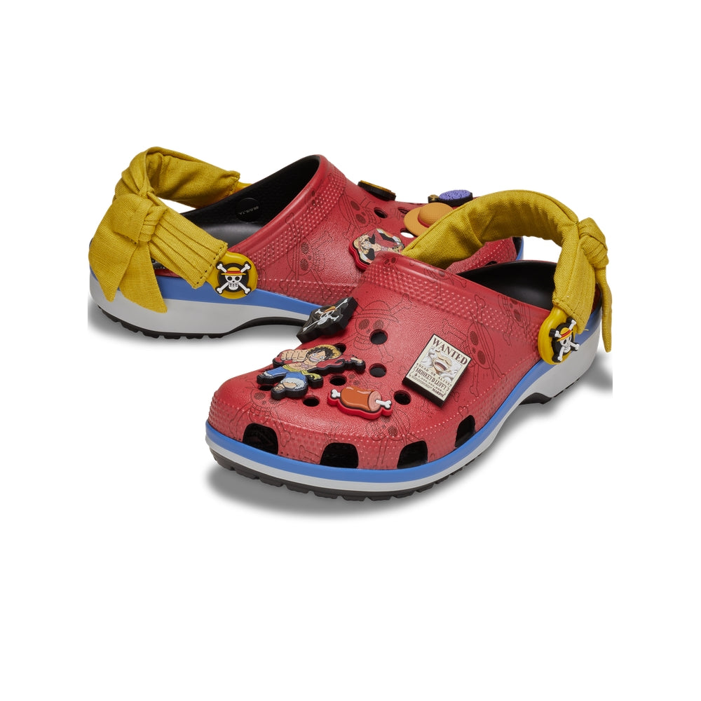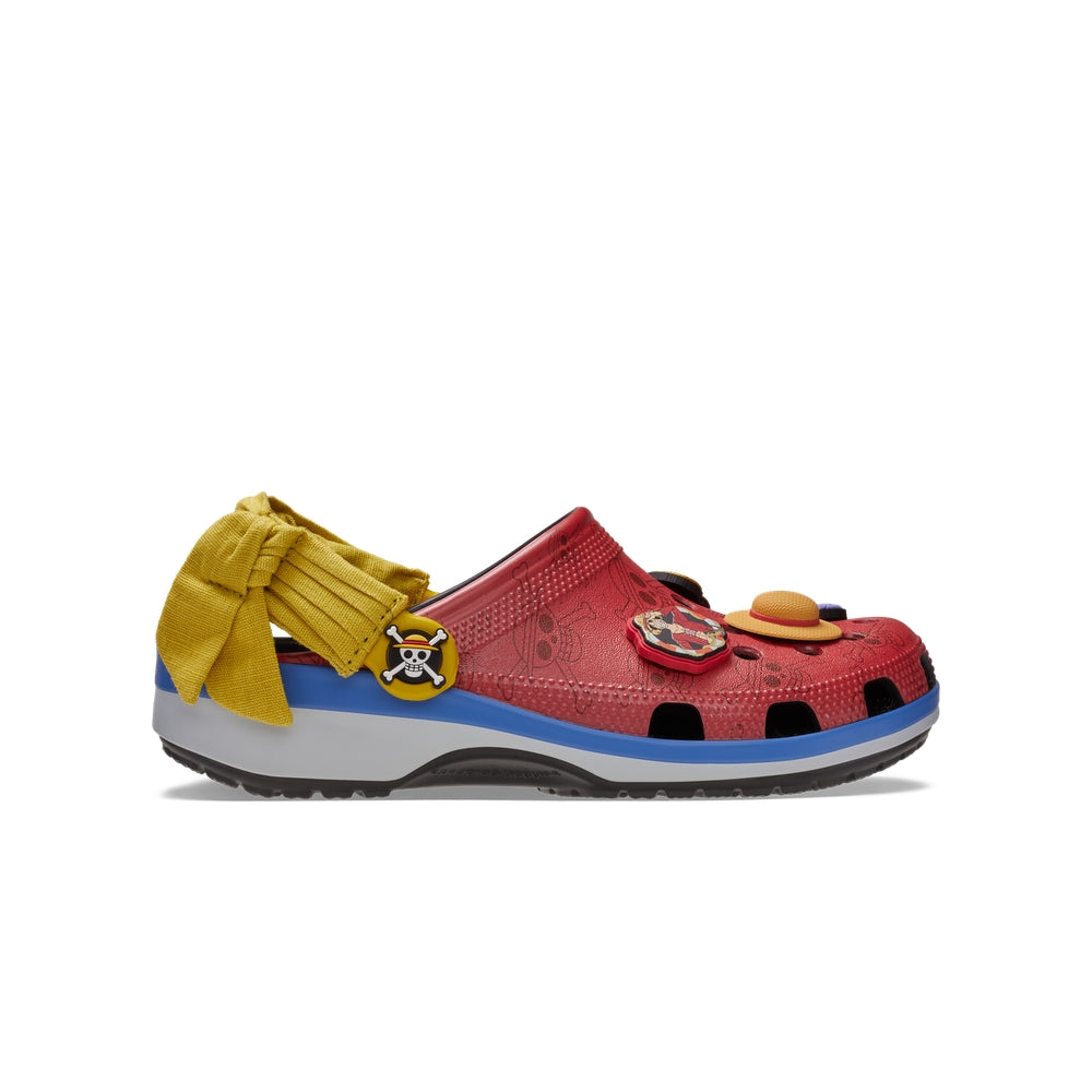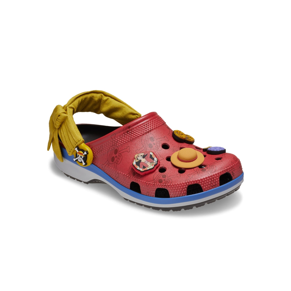 Feel free to explore the world in the new Luffy Classic Clog from the ONE PIECE collection. Carefree comfort meets character details like Monkey D. Luffy ’s yellow sash wrapped around the backstrap with the skull of the Straw Hat Crew as a custom rivet. A red upper showcases eight custom Jibbitz™ charms including gold coins, a straw hat, and a wanted poster.